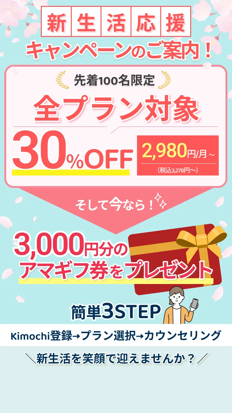 Kimochiで初めてプラン登録をされる方に、Amazonギフトカード3,000円分をプレゼントします。