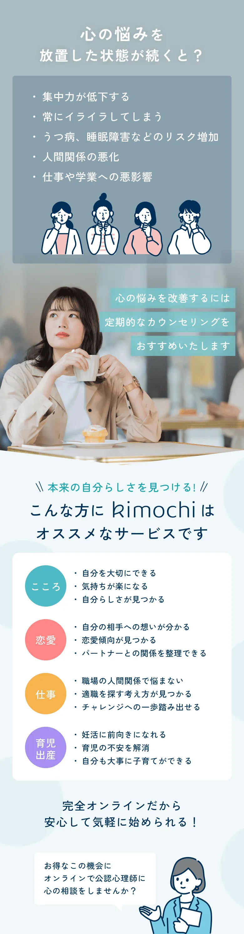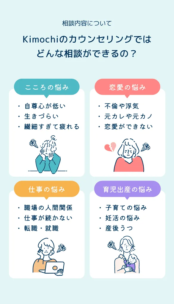 Kimochiでは、日常の小さな悩みから、深刻な問題まで幅広く対応しています。