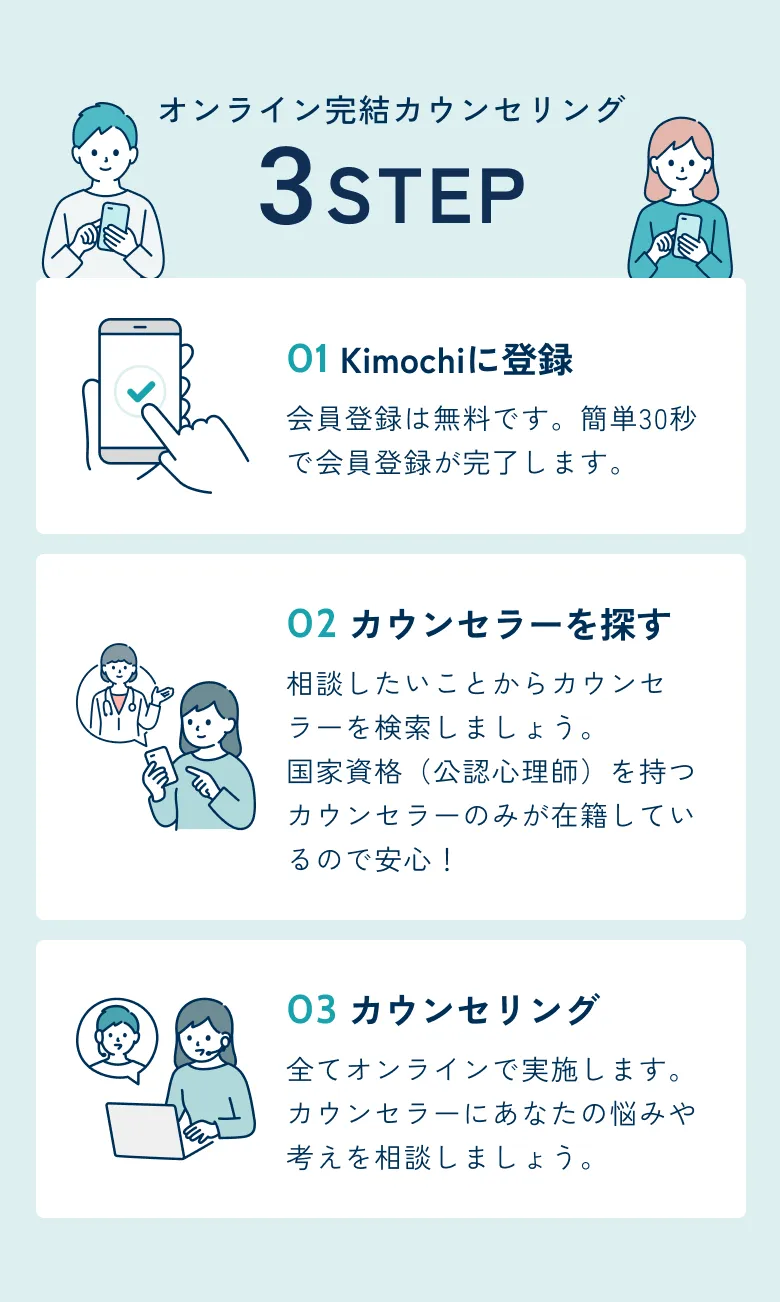 Kimochiは指導医の監修のもと、相談経験300回以上の臨床心理士・公認心理師による質の高いカウンセリングが受けられます。